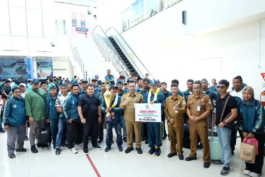 NiBFC, PANGKALPINANG – Pulang dengan torehan Juara Umum POPDA XII tingkat Provinsi Kepulauan Bangka Belitung, Sekretaris Daerah Kota Pangkalpinang, Mie Go menyambut kedatangan atlet POPDA Kontingen Kota Pangkalpinang di Bandara Depati Amir, Senin (29/7/2024).