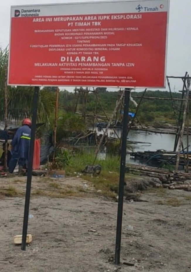 “Itu Bang lah ade papan larangan. Tapi tidak ada penambang yang takut. Bahkan, papan plang milik PT Timah Tbk. yang sebelumnya terpampang di area itu kini sebagian dilaporkan hilang, diduga akibat ulah para penambang ilegal,” ujar salah satu warga kepada media ini, Selasa (14/10/2025).