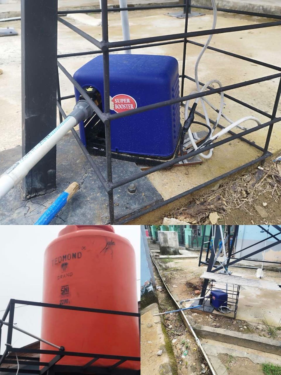 Fasilitas yang terpasang meliputi sumur bor yang diduga mempunyai diameter sekitar 6 inci, mesin air jenis celup, tandon (tedmond) berkapasitas 2.200 liter, menara air, serta pipa distribusi yang terhubung ke jaringan yang sudah ada di sekolah.