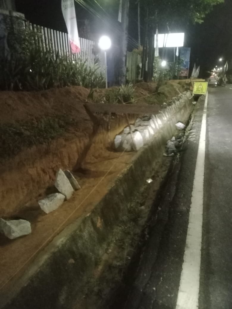 Batu gunung terlihat dipasang langsung di atas pondasi lama tanpa adanya pembongkaran total atau pembangunan pondasi baru.